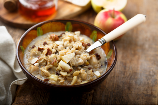 In a large container (at least 2 1/2 qt.) with a lid, combine oats, 4-grain cereal, dates, apples, walnuts, brown sugar, cinnamon, ginger, turmeric, and cloves.